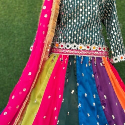 Make your little princess shine this Mehndi! ✨ Luxury bottle-green sequined organza shirt paired with raw silk gota patti multi-panel