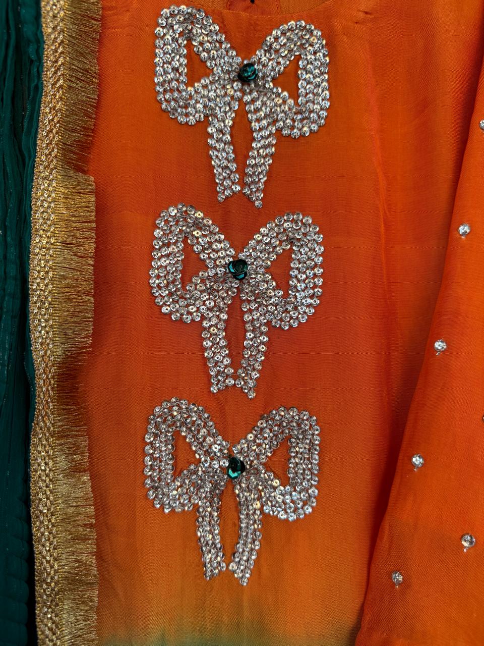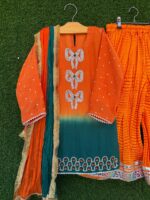 Featuring a beautifully handmade muse bow neckline, detailed daman work, and a gorgeous crush gharara with gotta border, paired with a matching dupatta for the perfect festive look. ✨👗