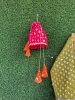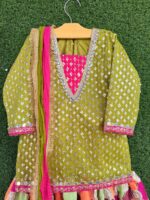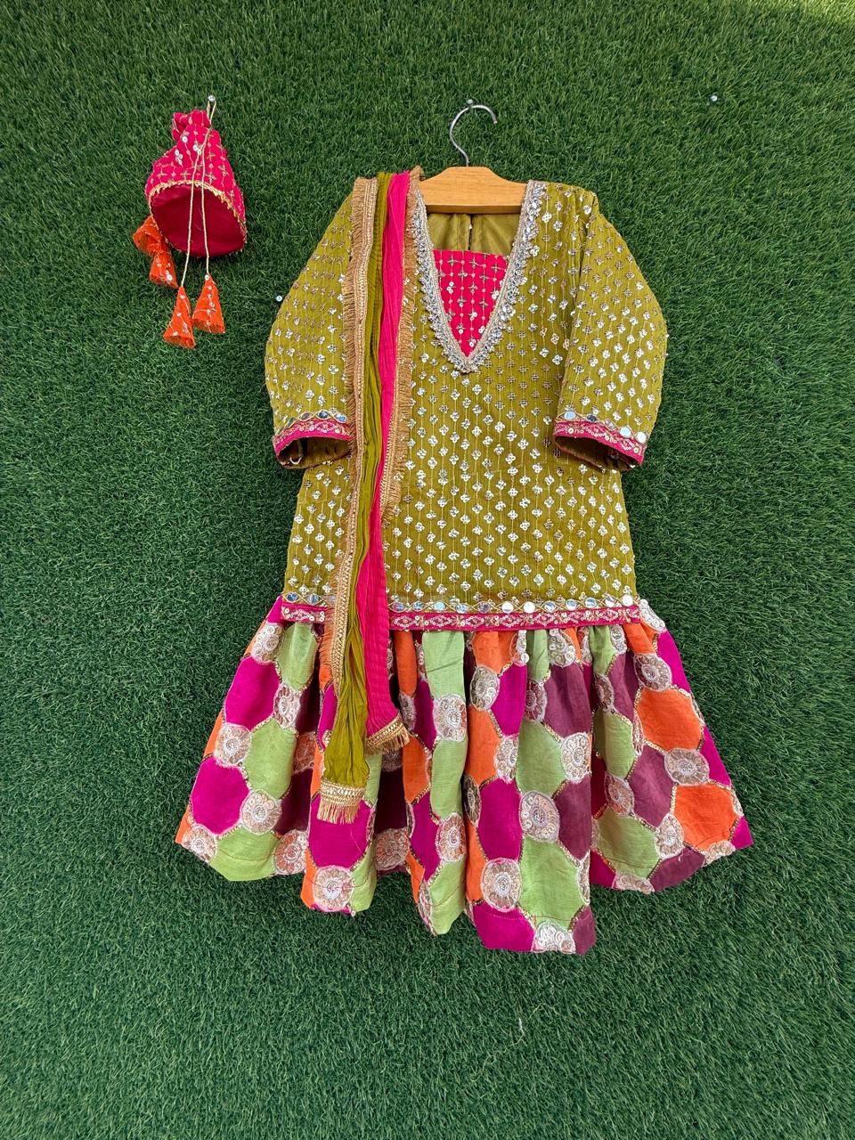 Heavily sequined chiffon shirt with mirror lace neckline, paired with multi-tone Russian silk gharara and contrast crush dupatta with potli — a perfect mehndi look for your little one.