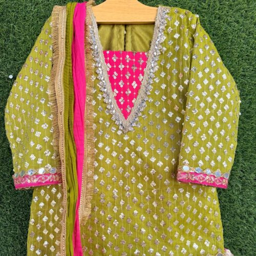 Chachu Ki Dholki (Mehndi Luxury) A festive statement outfit that celebrates traditional charm with a modern twist. This pure 9mm
