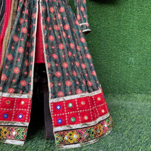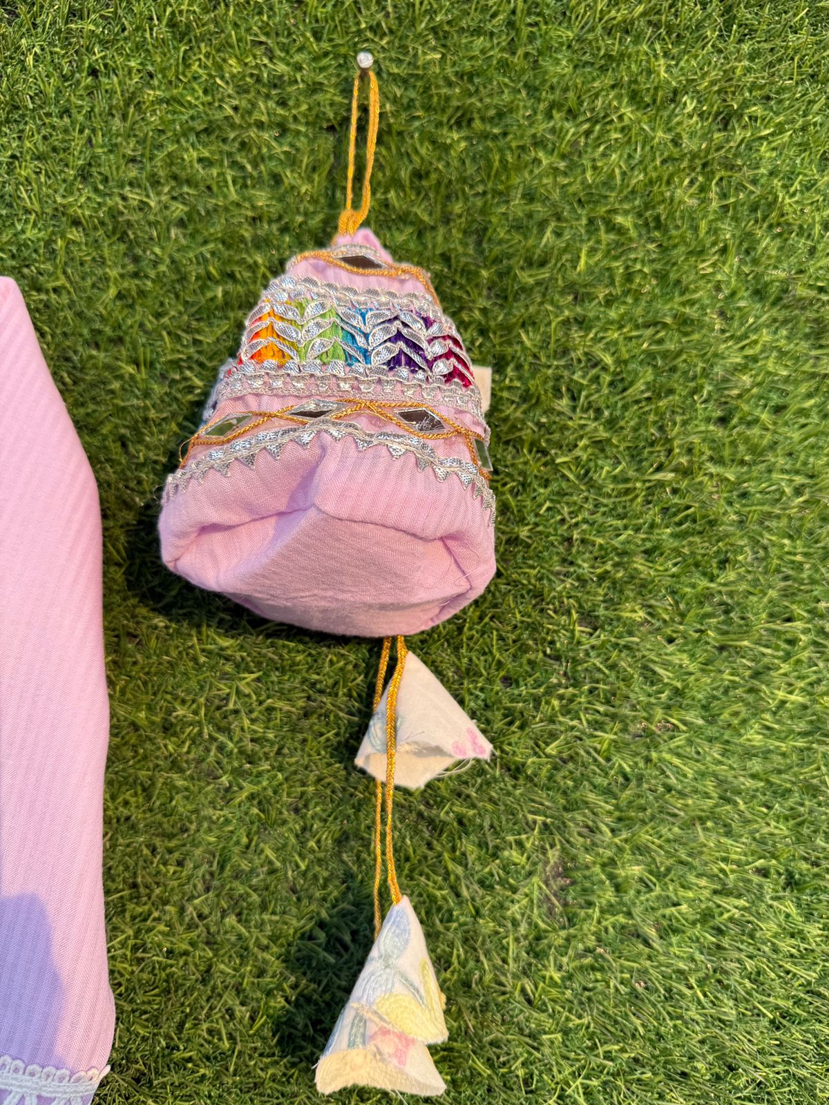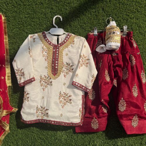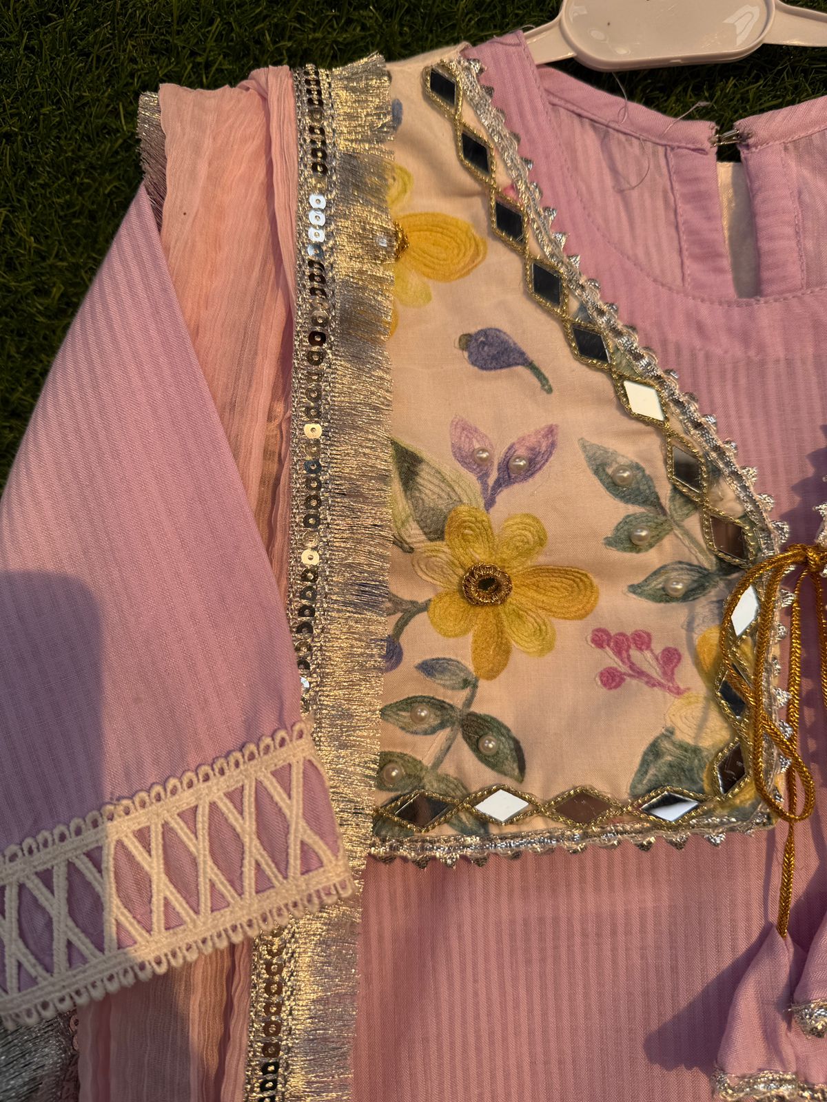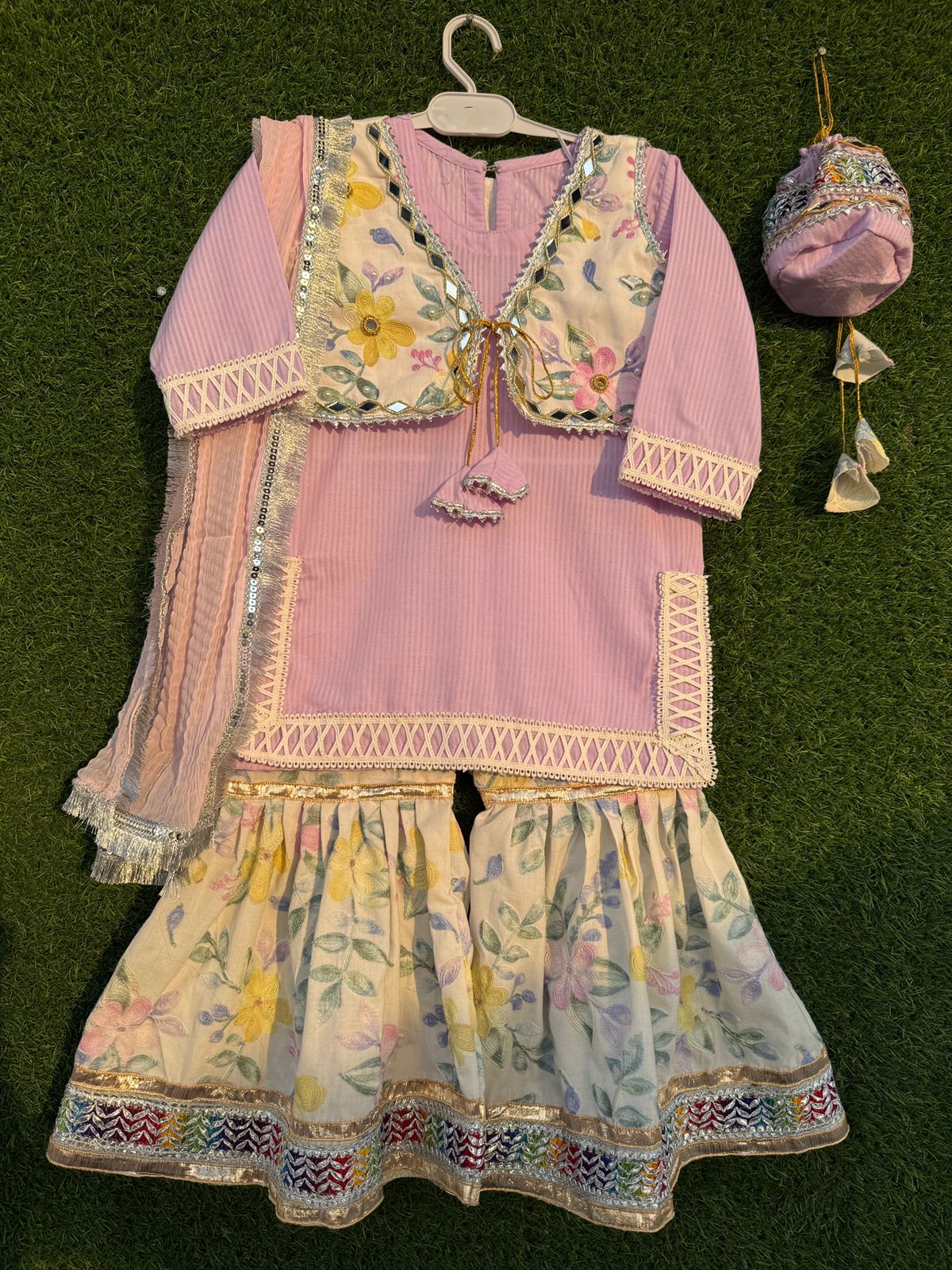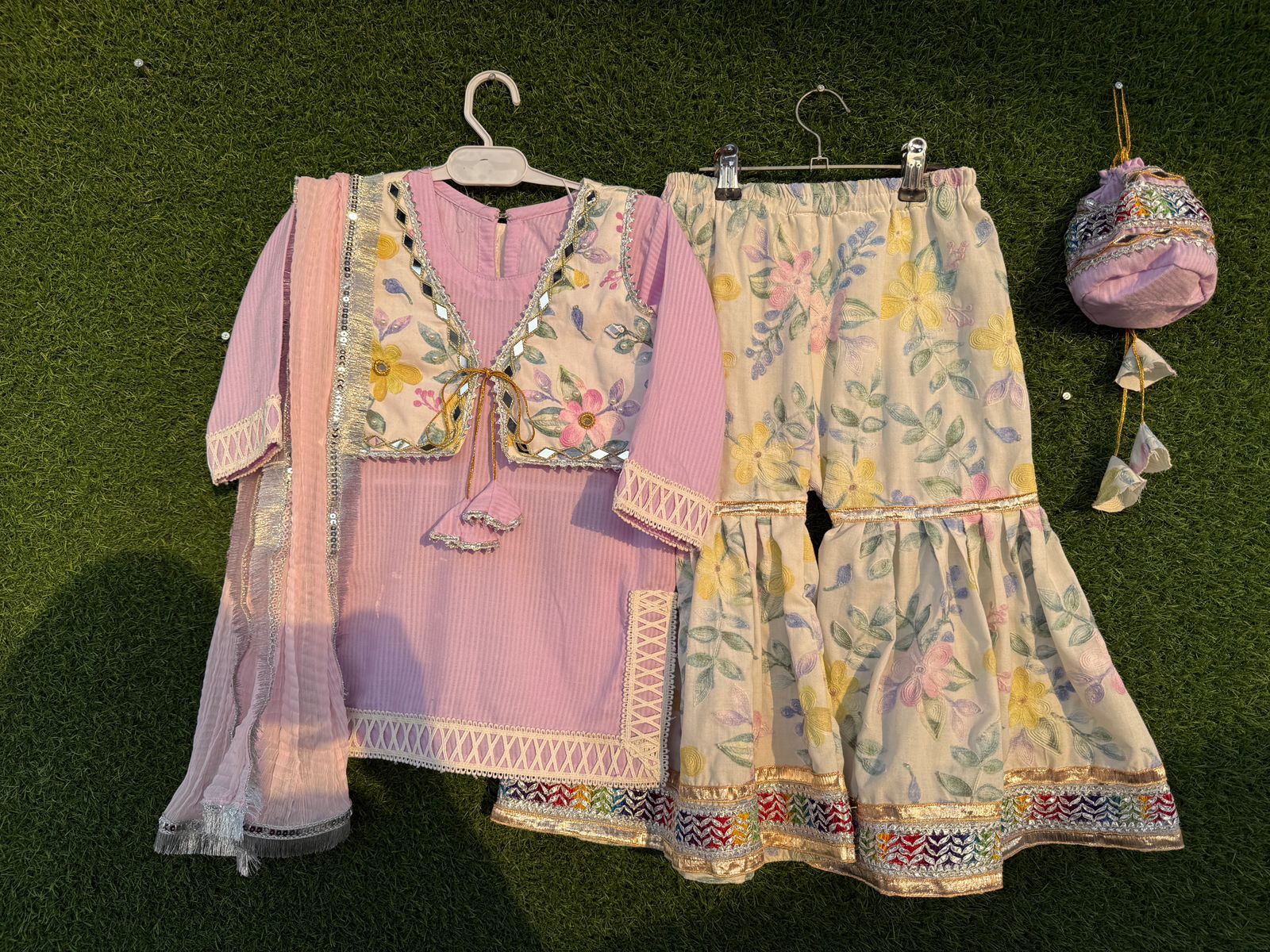 A dreamy pastel white & light purple festive set for little princesses. Featuring a fully embellished embroidered gotta koti with pearls and mirror work, paired with a plain bana dora lawn shirt, embroidered gharara, contrasting dupatta, and matching potli.