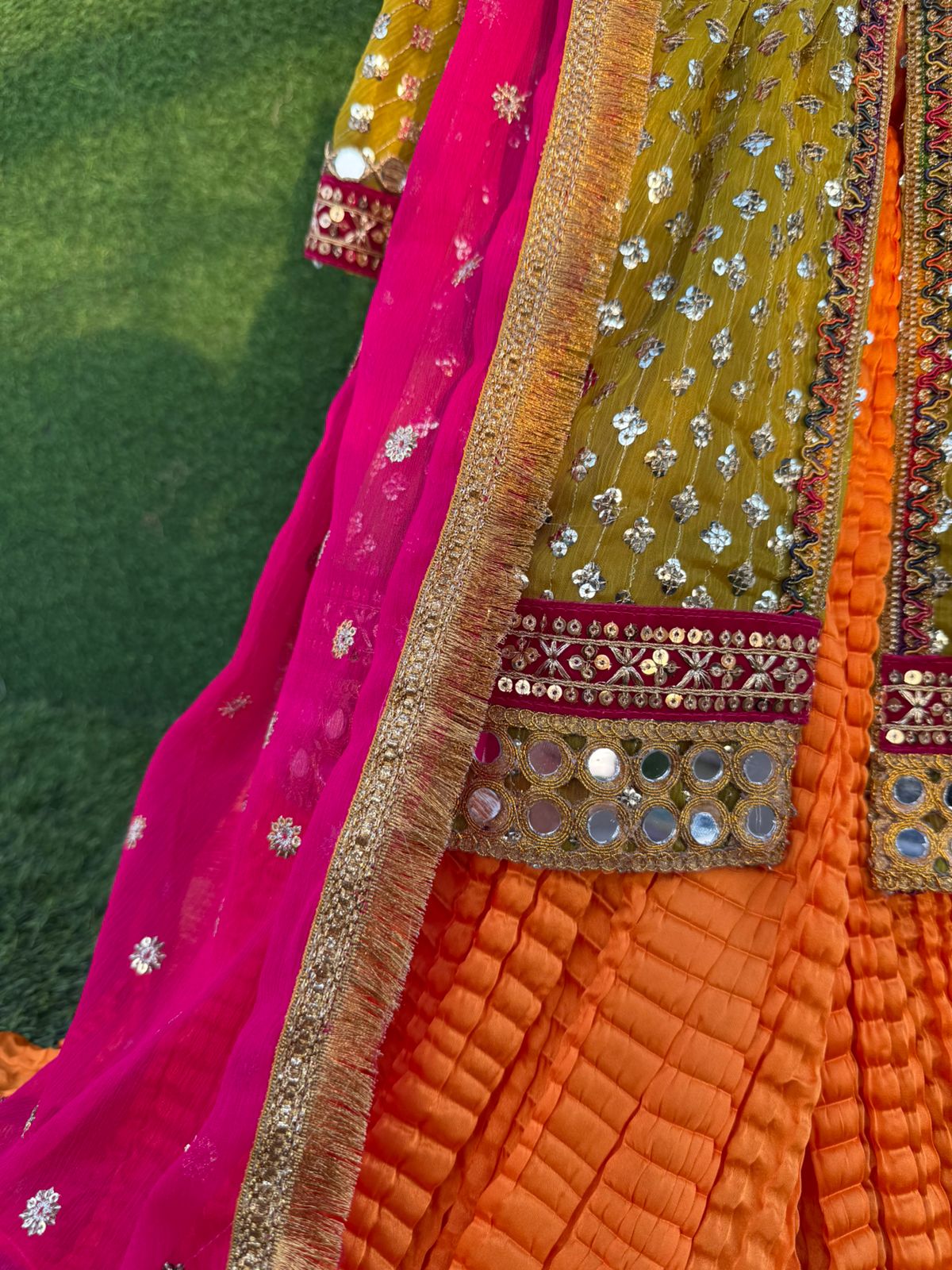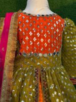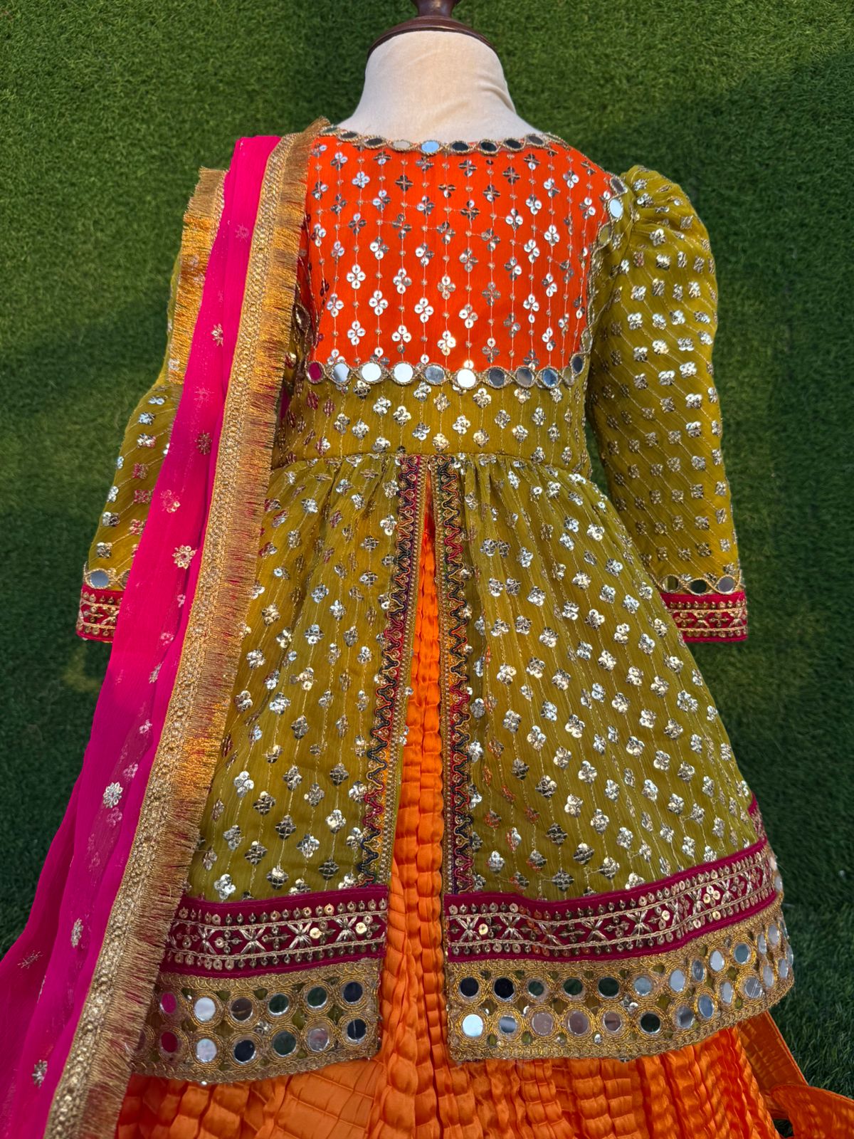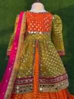 A festive statement outfit that celebrates traditional charm with a modern twist. This pure 9mm sequin short frock (peplum) features an open slit design, adorned with intricate heavy lace borders and a contrasting mirror-work neckline. It’s paired beautifully with a crushed lehnga and a contrasting dupatta, perfect for mehndi and dholki festivities.