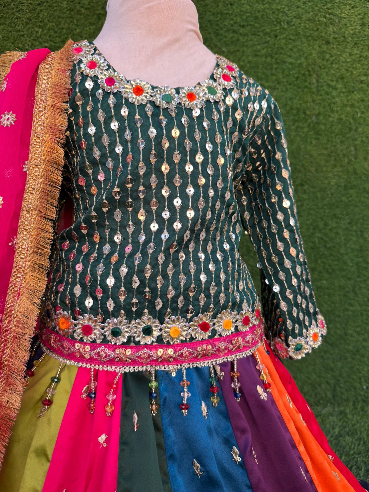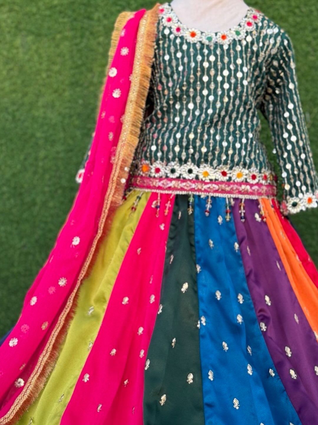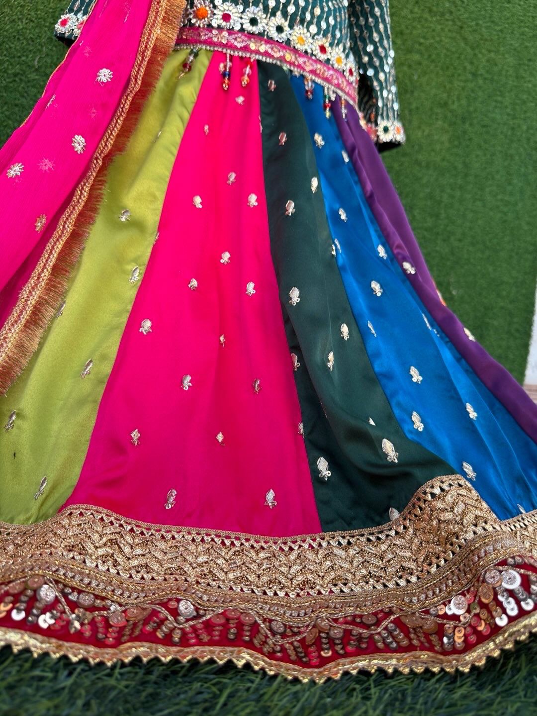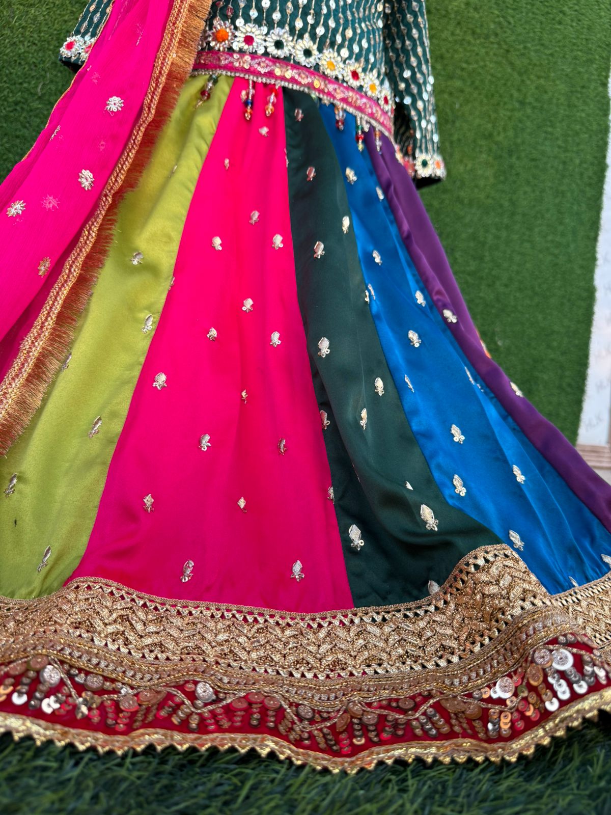 Luxury bottle-green sequined organza shirt paired with raw silk gota patti multi-panel lehnga, heavy lace borders, and contrasting dupatta with potli detailing. Perfect for festive occasions! 🌸