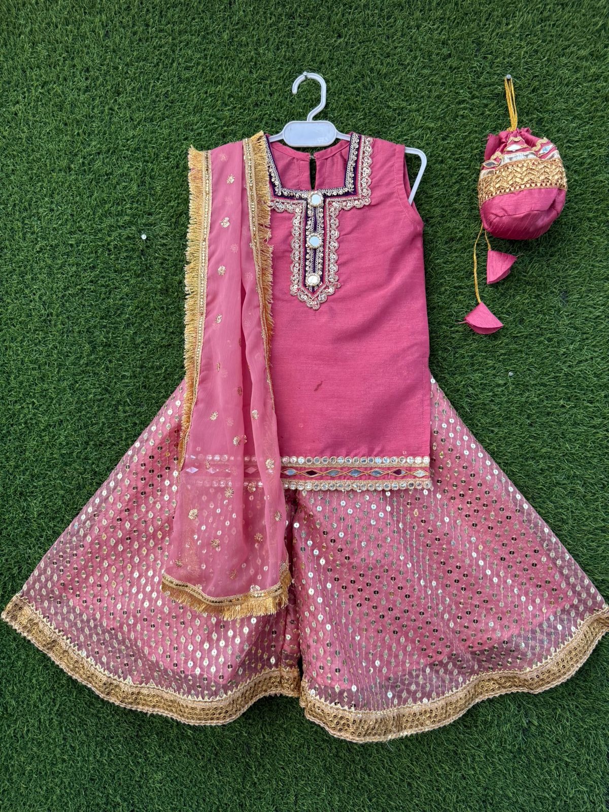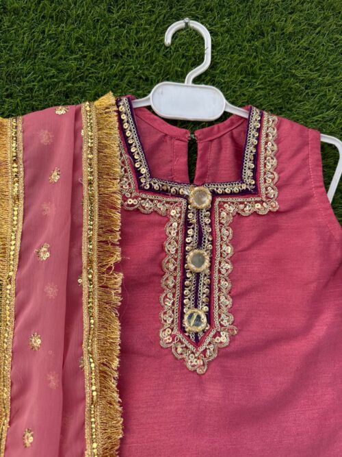 A stunning T-Pink pure raw silk shirt, beautifully styled with handmade lace detailing on the neckline and sheesha work on the daman, paired with a sequence organza sharara, chiffon dupatta, and a matching potli bag β designed for your little oneβs festive sparkle πΈ